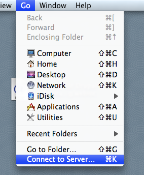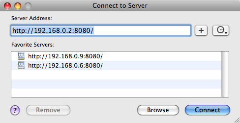 Next, choose Go | Connect to Server... from the Finder, and enter the connection URL in the Server Address field. (That's the address of your iPhone or iPod Touch–the address displayed on the TouchFS Options screen above)