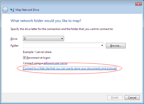 Next, DO NOT enter anything in the Folder: text box, but instead click the Connect to a Web site... link at the bottom of the window.